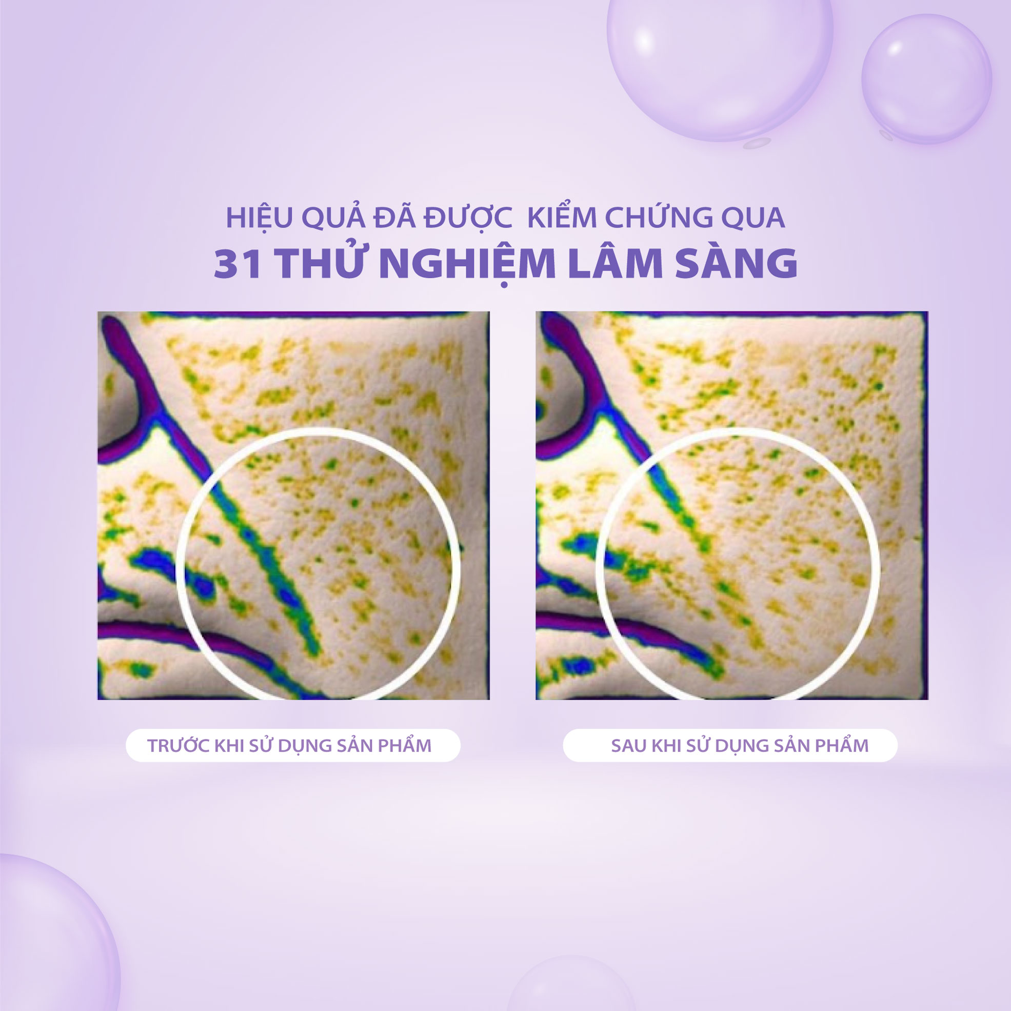 - Sản phẩm kết cấu dạng sủi bọt có khả năng thẩm thấu nhanh gấp 193% so với tinh chất bình thường nên đem lại hiệu quả cao trong lấp đầy những cấu trúc hư tổn của da, xoá nếp nhăn da, giúp da căng bóng tự nhiên.