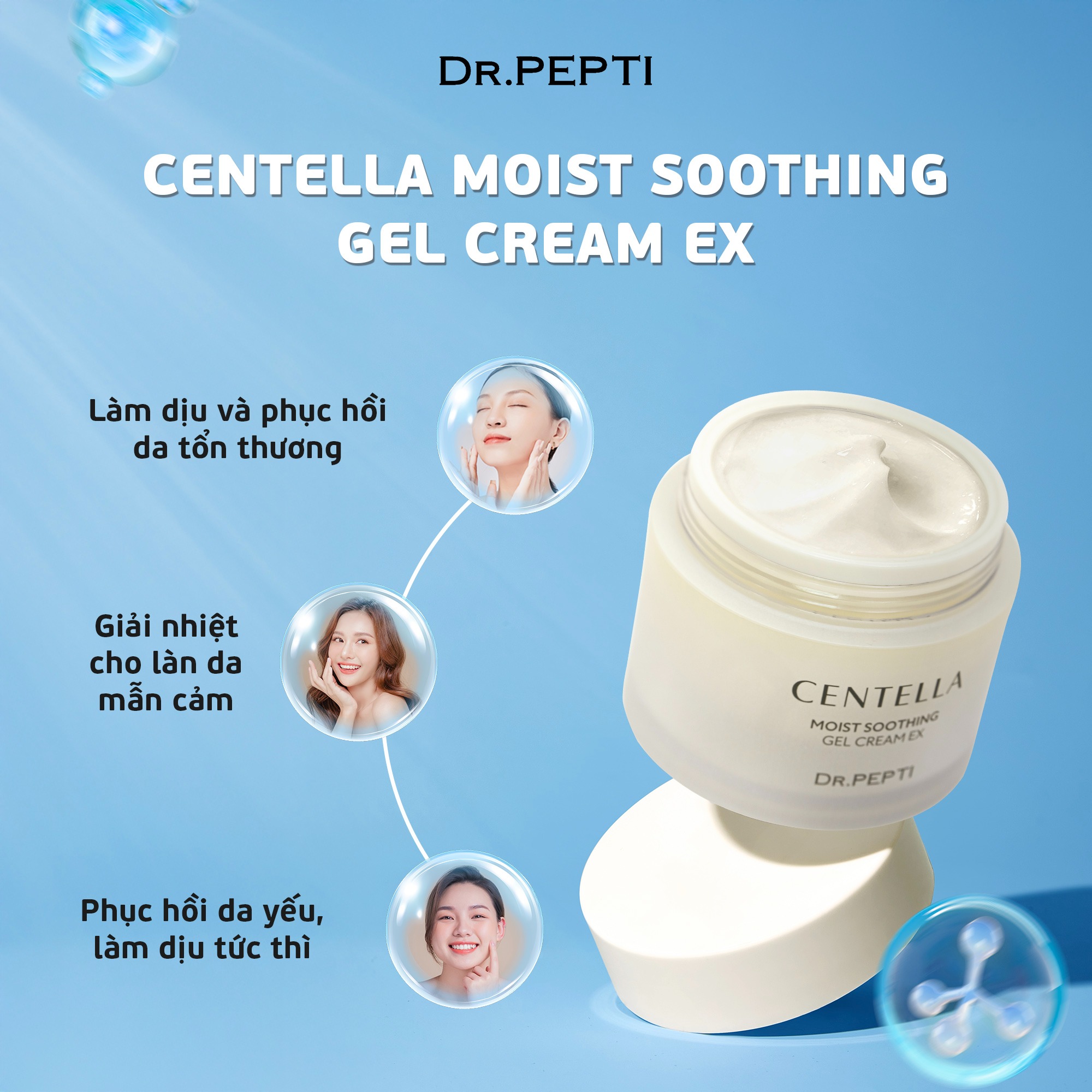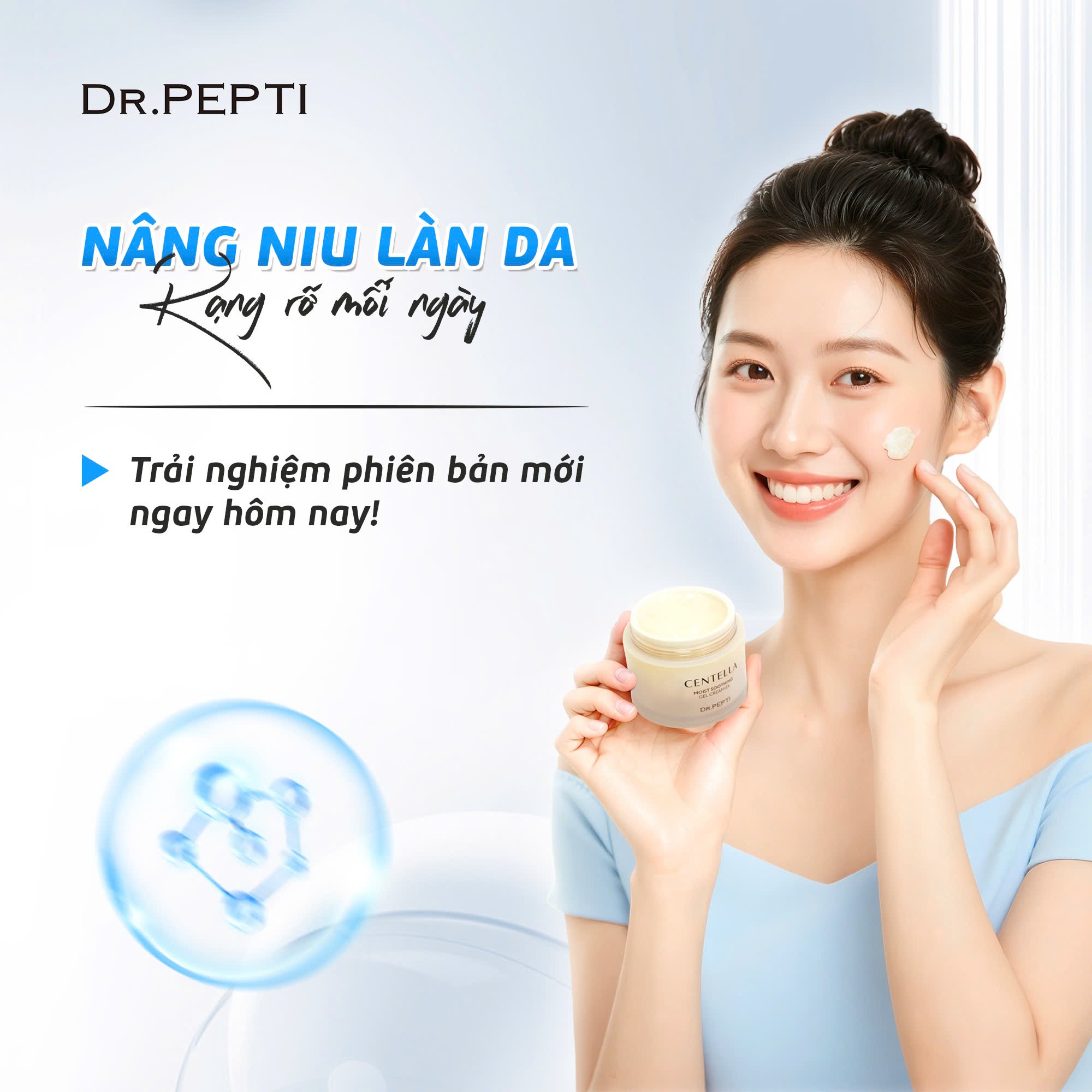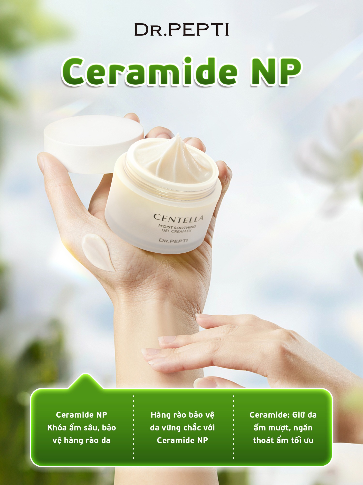 Kem dưỡng ẩm Dr.Pepti không chỉ đơn thuần là sản phẩm khóa ẩm mà còn là giải pháp toàn diện để củng cố hàng rào bảo vệ da. Kem dưỡng ẩm Dr.Pepti với công thức rau má, HA đa tầng, peptide và ceramide mang đến giải pháp cấp ẩm sâu, phục hồi da và duy trì độ căng bóng suốt 24 giờ.