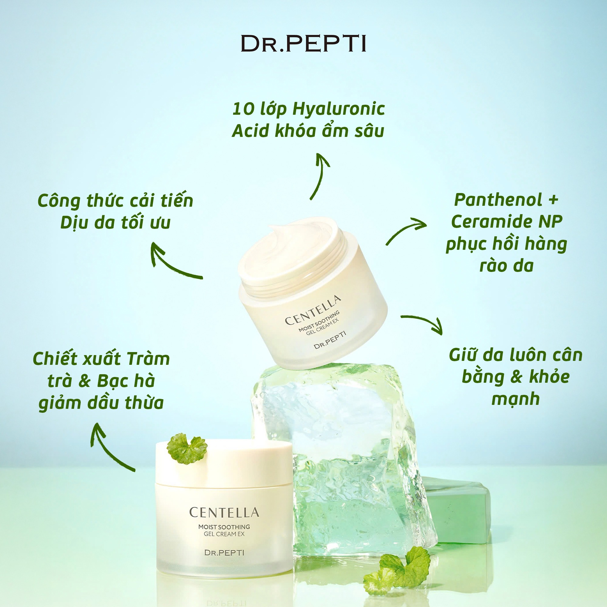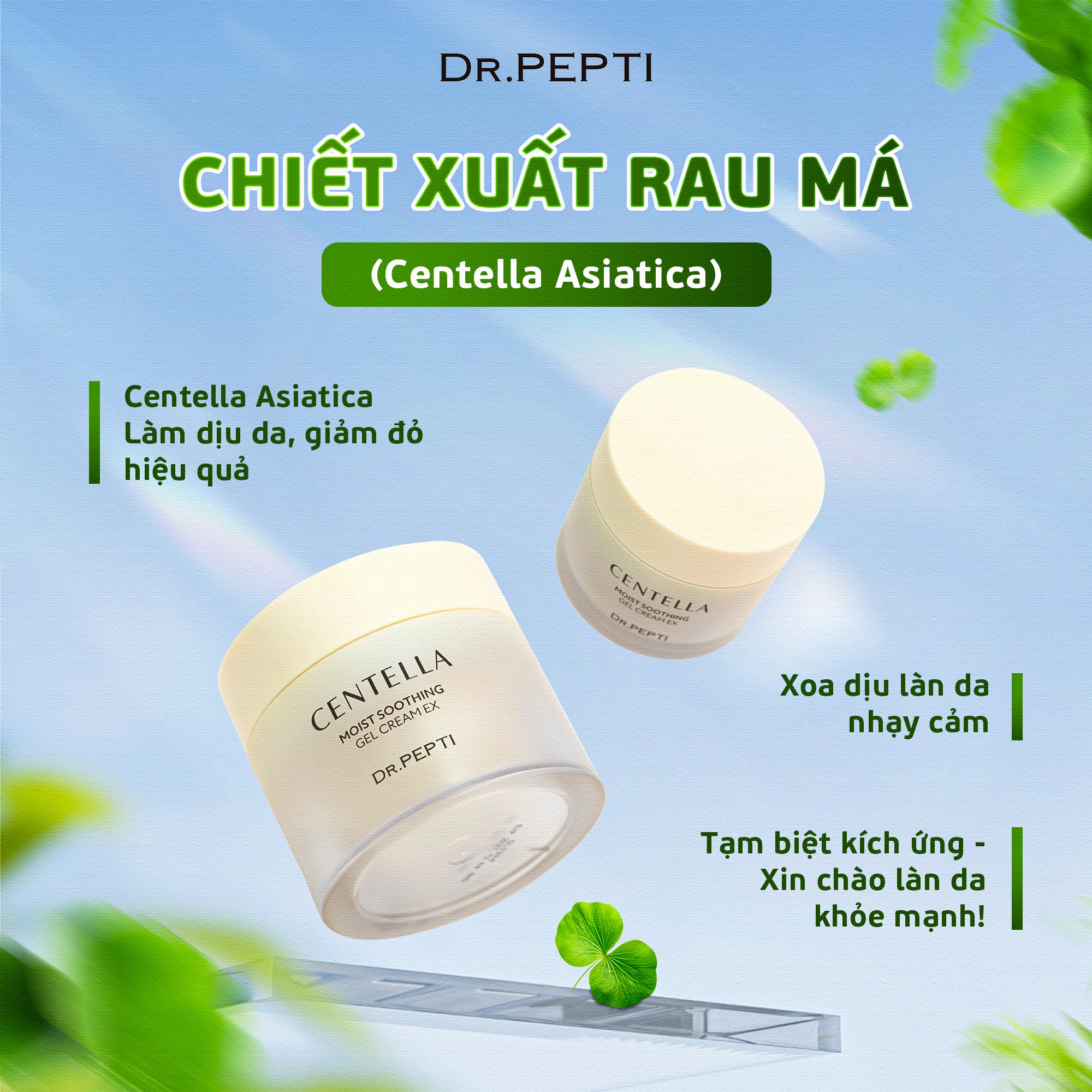 Với tỷ lệ chiết xuất rau má lên đến 72,4%, kem dưỡng ẩm Dr.Pepti giúp: