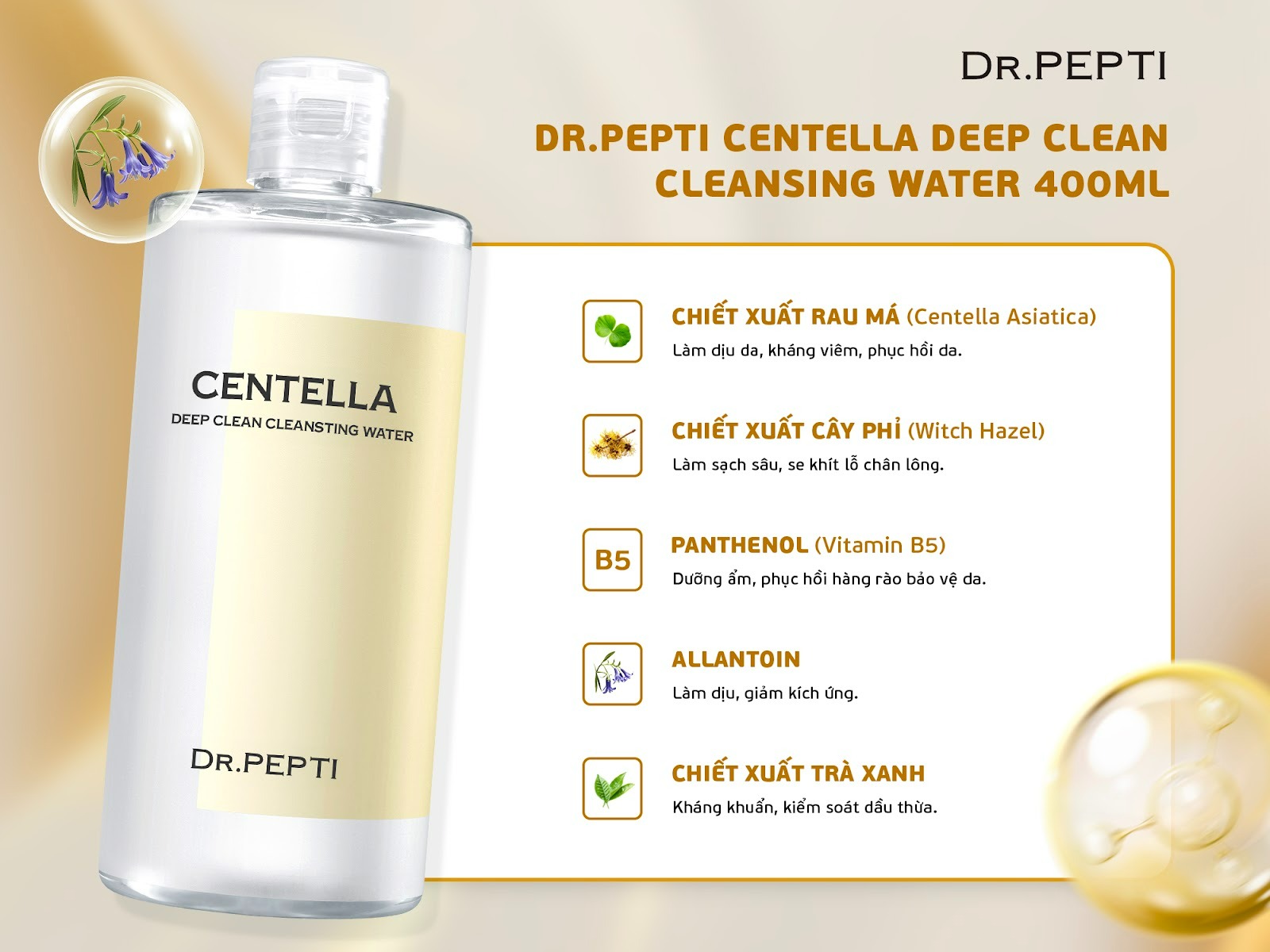 Nước Tẩy Trang Dr.Pepti Centella Deep Clean được thiết kế để: