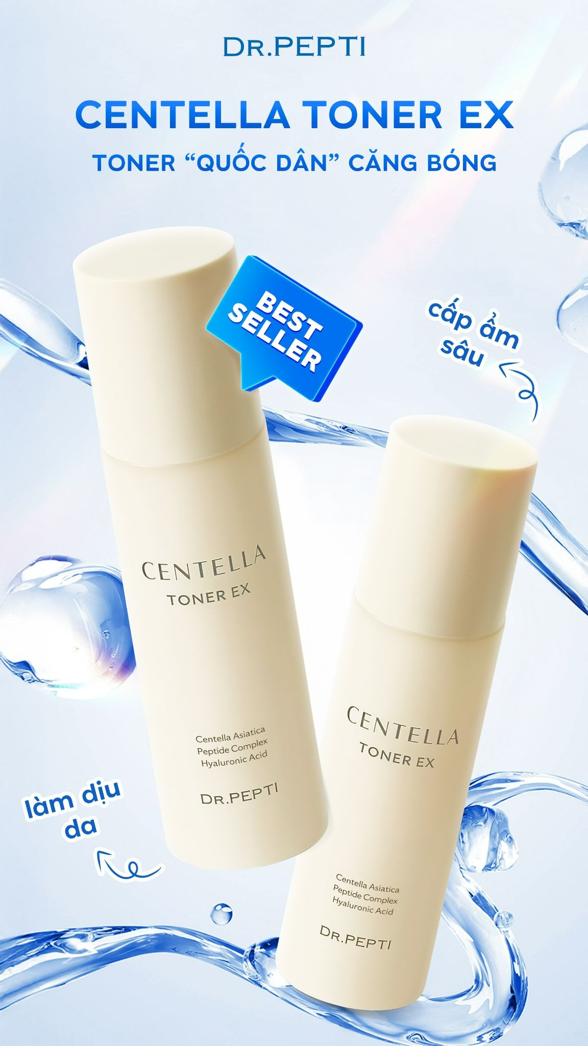 Toner Dr.Pepti Centella Toner EX là dòng toner cao cấp được nhiều người yêu thích nhờ bảng thành phần nổi bật và hiệu quả thấy rõ ngay từ lần đầu sử dụng. Không phải ngẫu nhiên mà hơn 2.500.000 chai đã được bán ra, với phản hồi quen thuộc: