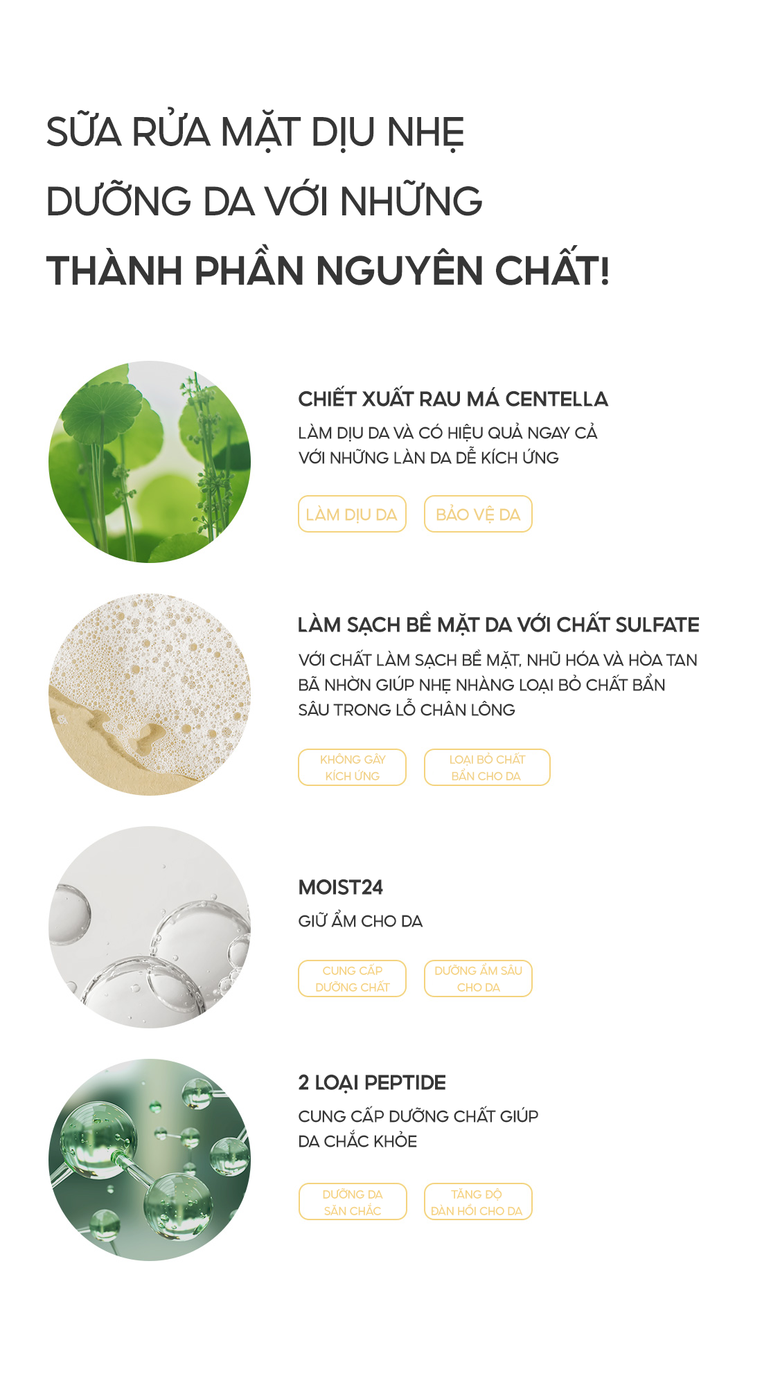 - Chiết xuất rau má: Được ghi nhận về khả năng làm dịu tổn thương và giảm biểu hiện của mụn viêm, giúp những làn da đang bị kích động bởi các tác nhân gây tổn thương cảm thấy dễ chịu hơn. Đặc biệt, chiết xuất rau má cực lành tính, giúp làm sạch mà không làm da mất nước, vẫn lưu giữ được độ ẩm mịn, mềm mại trên da